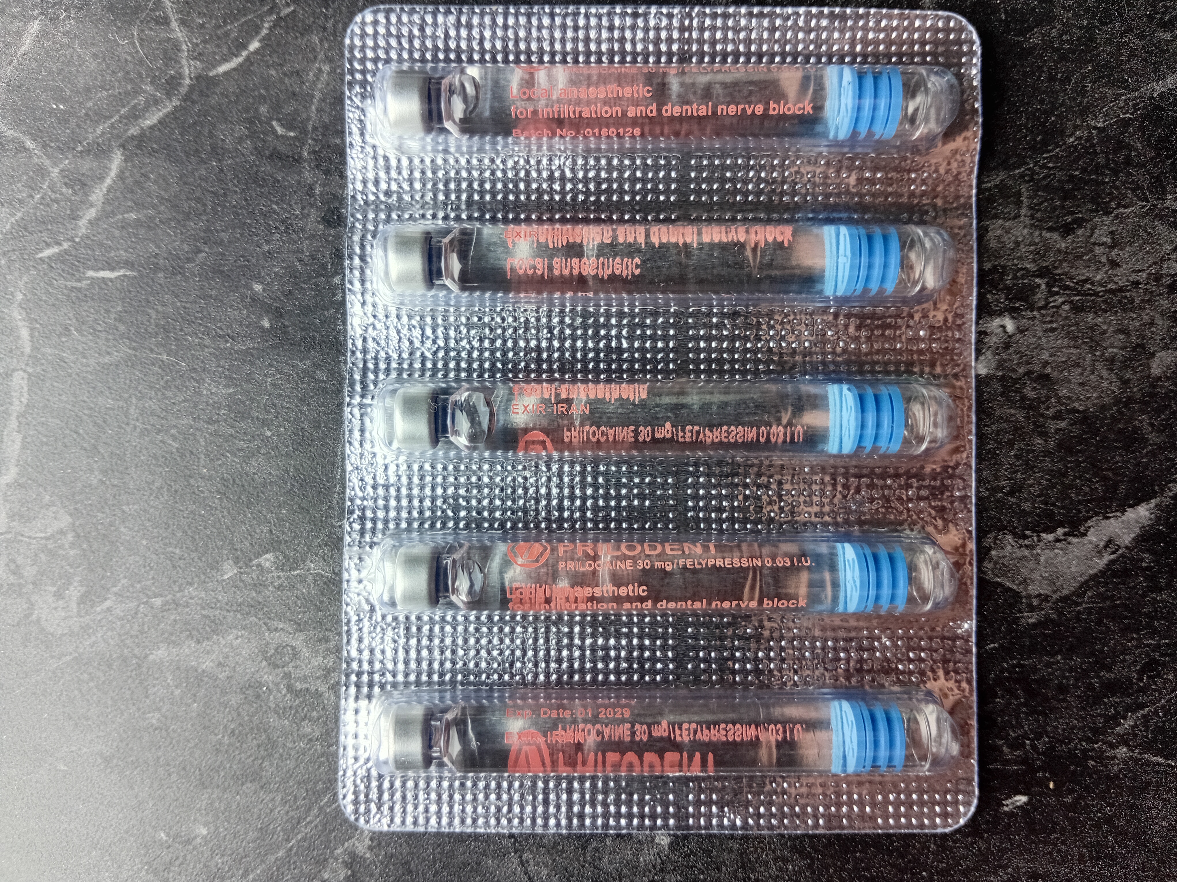 بی حسی دندانپزشکی (کارپول) 3% اکسیر-کارتریج پریلودنت - پریلوکائین 5 عددی(تاریخ انقضا 30 ماه ) ارسال 8 صبح هر روز با پست و تیپاکس